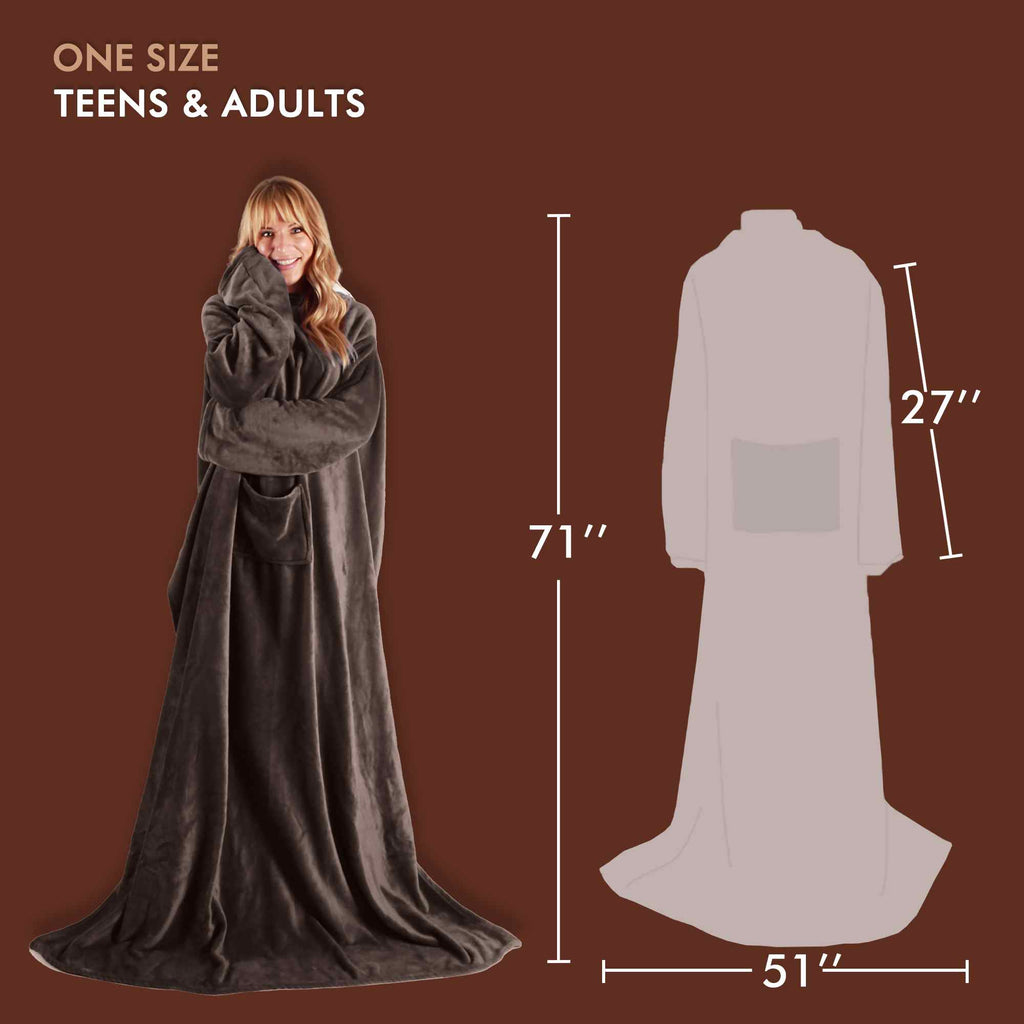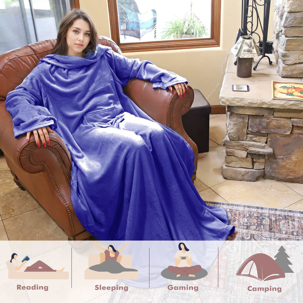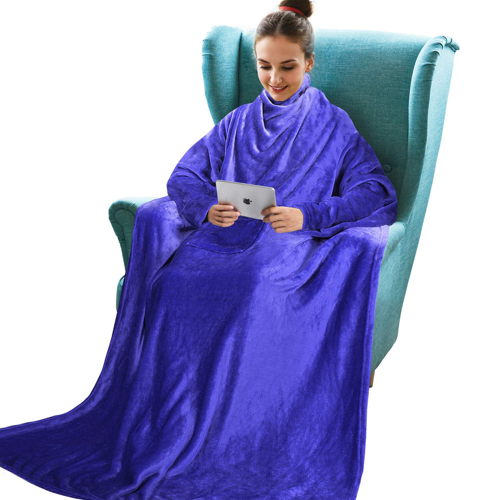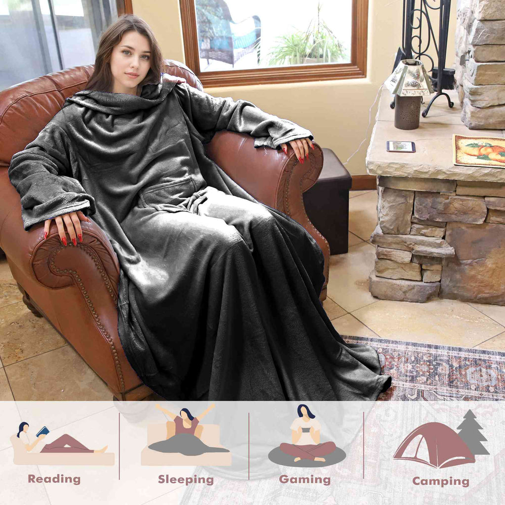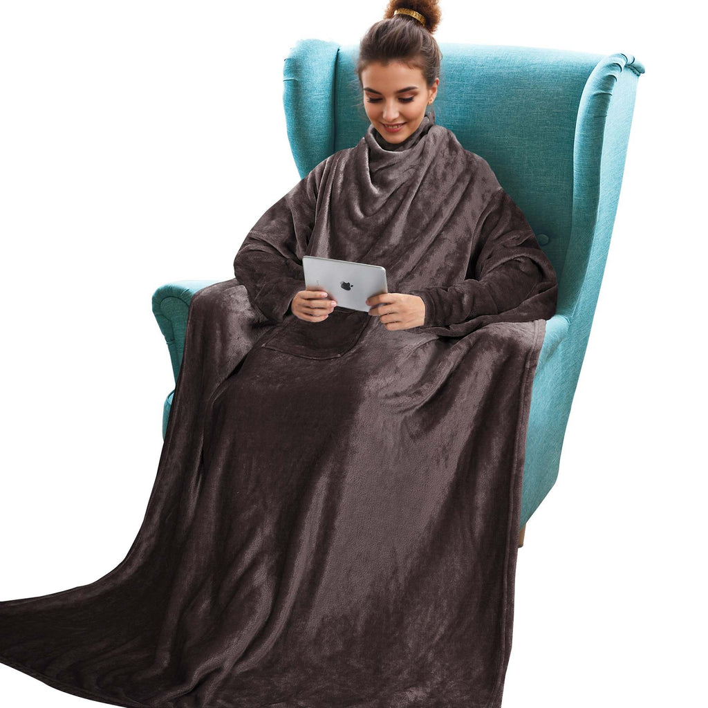This snuggie blanket with sleeves is perfect for lounging inside the house when you want something fuzzy to hug on, and it even has pockets! You can freely place the remote control, cell phone, and snacks in the huge pocket.