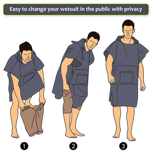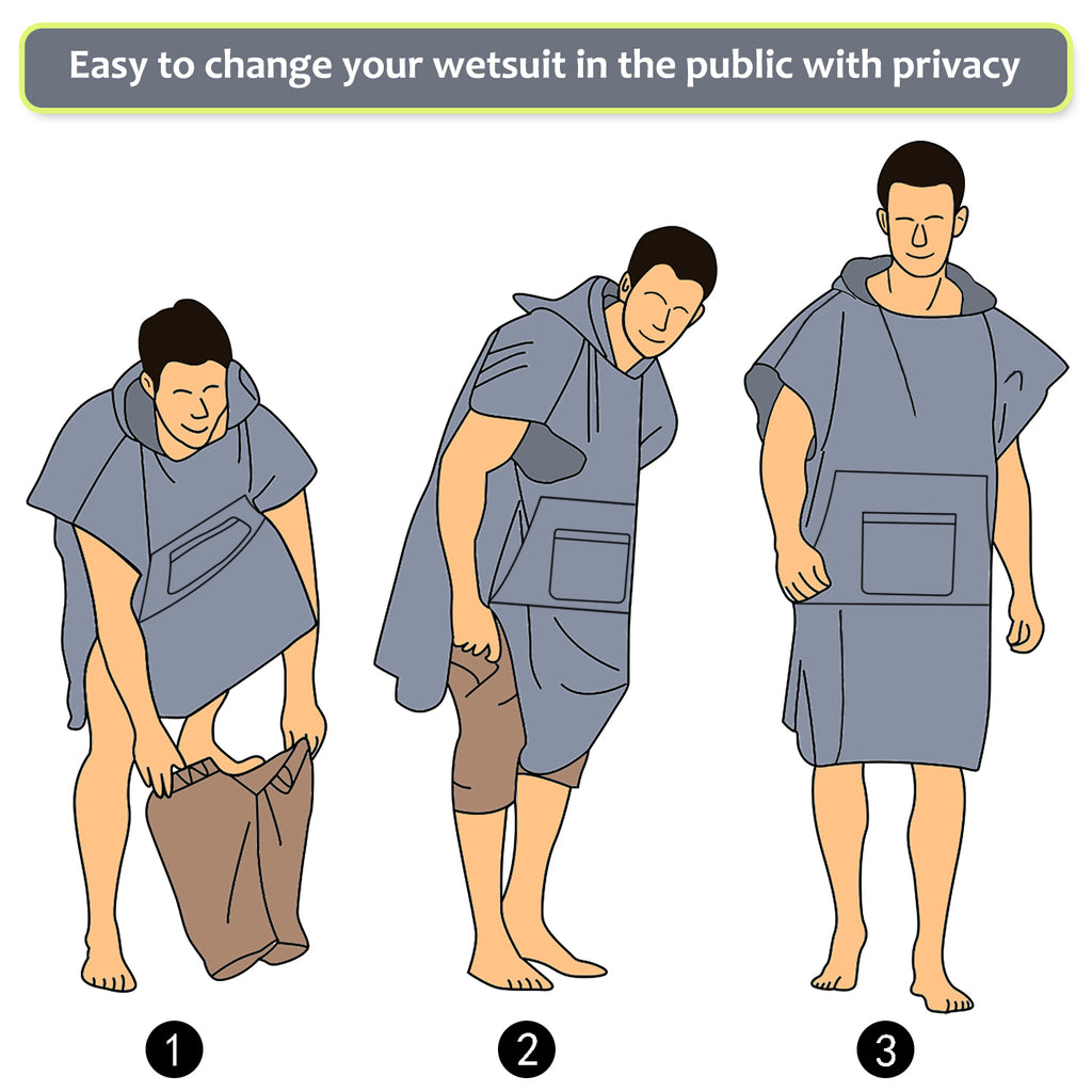 The super-absorbent changing towel is made of 85% microfiber polyester and 15% polyamide, which allows you to quickly dry your wet body and hair after surfing or swimming, and also keeps you warm and comfortable. Ideal for changing into wetsuits, swimsuits and swimwear at the beach or pool. Designed for surfers, water sports and camping, this towel robe wrap is absorbent and quick drying. The soft terry towel cape robe doubles as a fully absorbent terry towel hoodie cover-up that can be air-dried after surfing or swimming to keep you comfortable, warm and dry. The wearable robe towel features a large hood and storable front pocket for your cell phone, wallet, keys and other essentials.