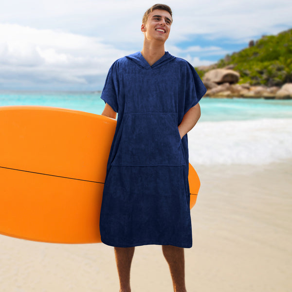 Our surf ponchos double as bathrobes and towels, making it easy, comfortable and warm to change into your wetsuit. The large beach towel has plenty of room to change without being exposed. The oversized hood protects your face from the wind and sun.