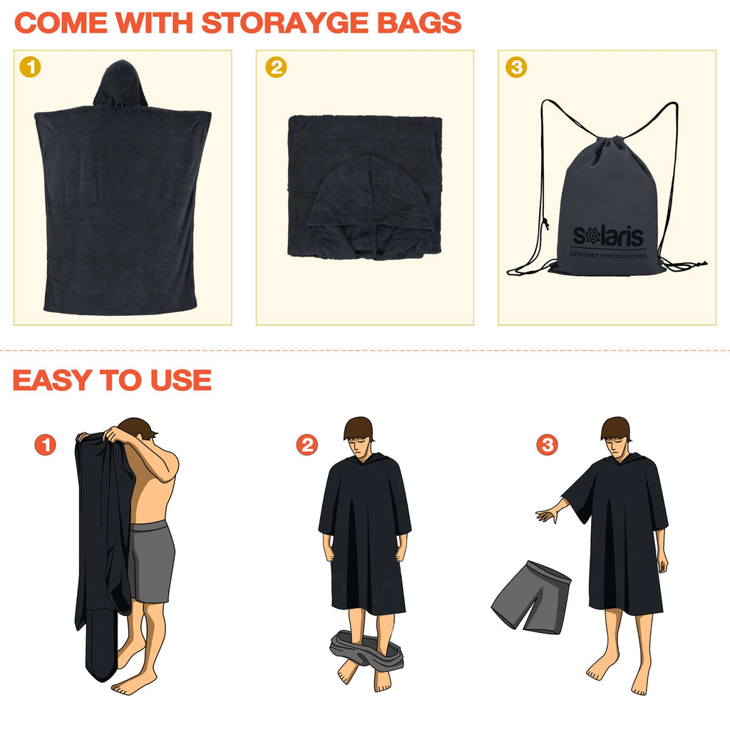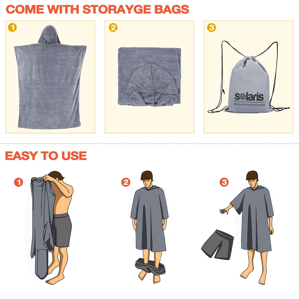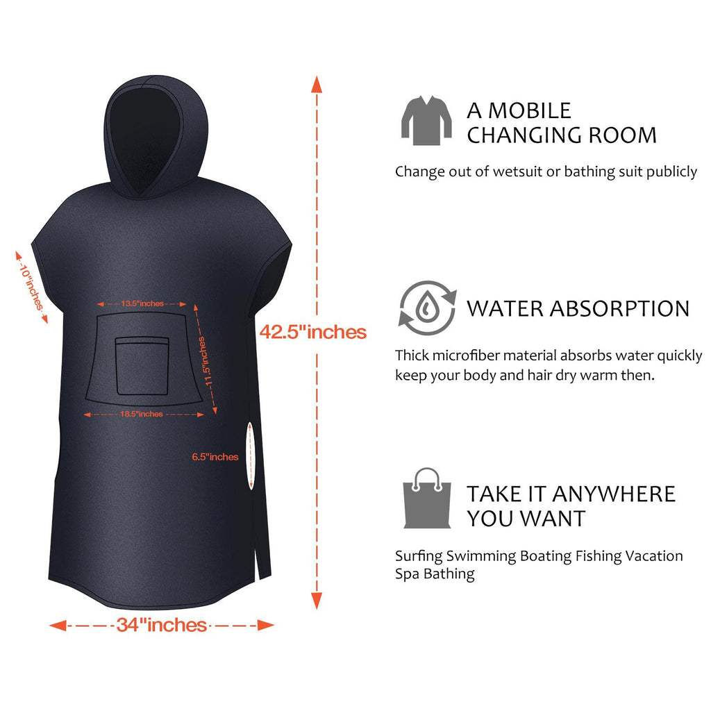 This surf changing poncho is specifically designed for surfers and other water sports enthusiasts to wear while changing into wetsuits or other gear. This is a hooded towel. The wearer can easily and covertly change their wet clothes, quickly wick away moisture and protect against the wind. Stay warm and dry.