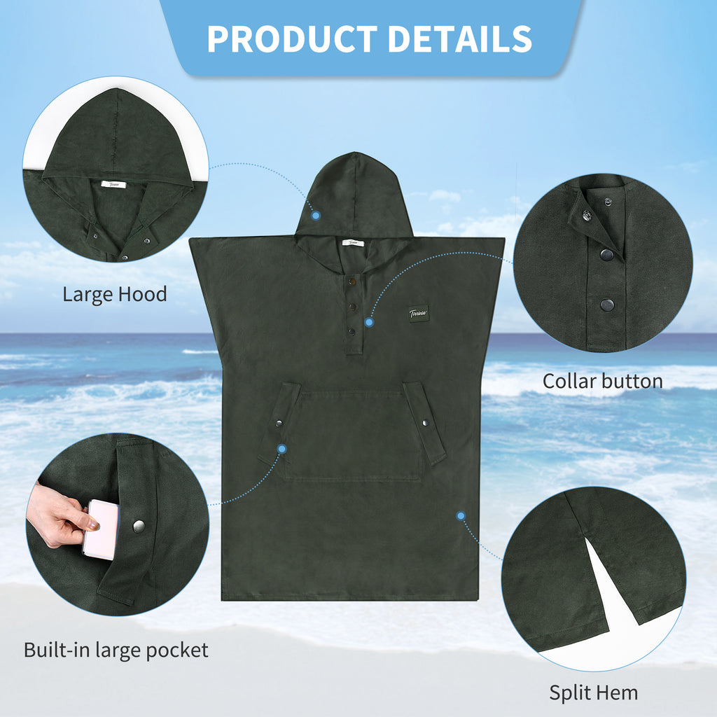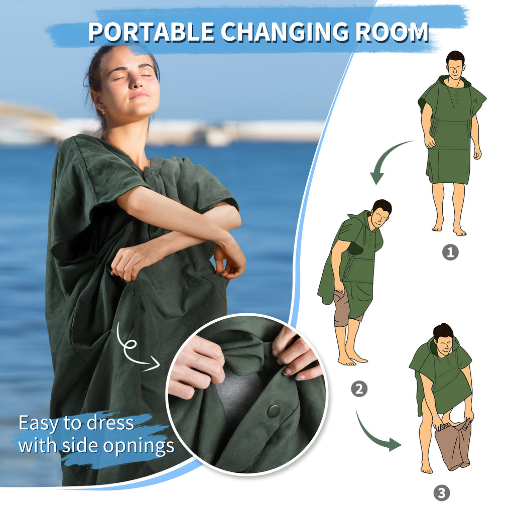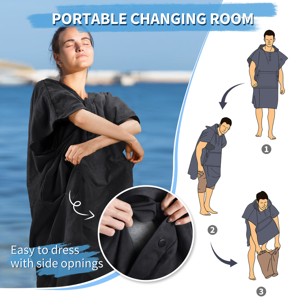 -Convenient and portable: with hood you can quickly dry your hair without the need to use a hair towel. Buttons on the collar enable you to take it on and off easily. The large center pocket can fit your belongings, and the pocket has a hidden compartment for changing clothes, so you can just stick your hands in the pocket and change into the bathing suit you're wearing. Invisible changing compartments make it easier to change at the beach.