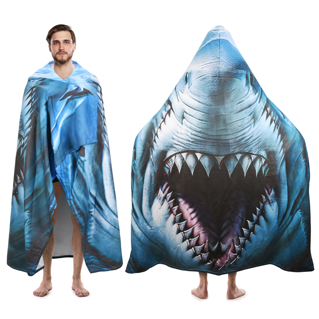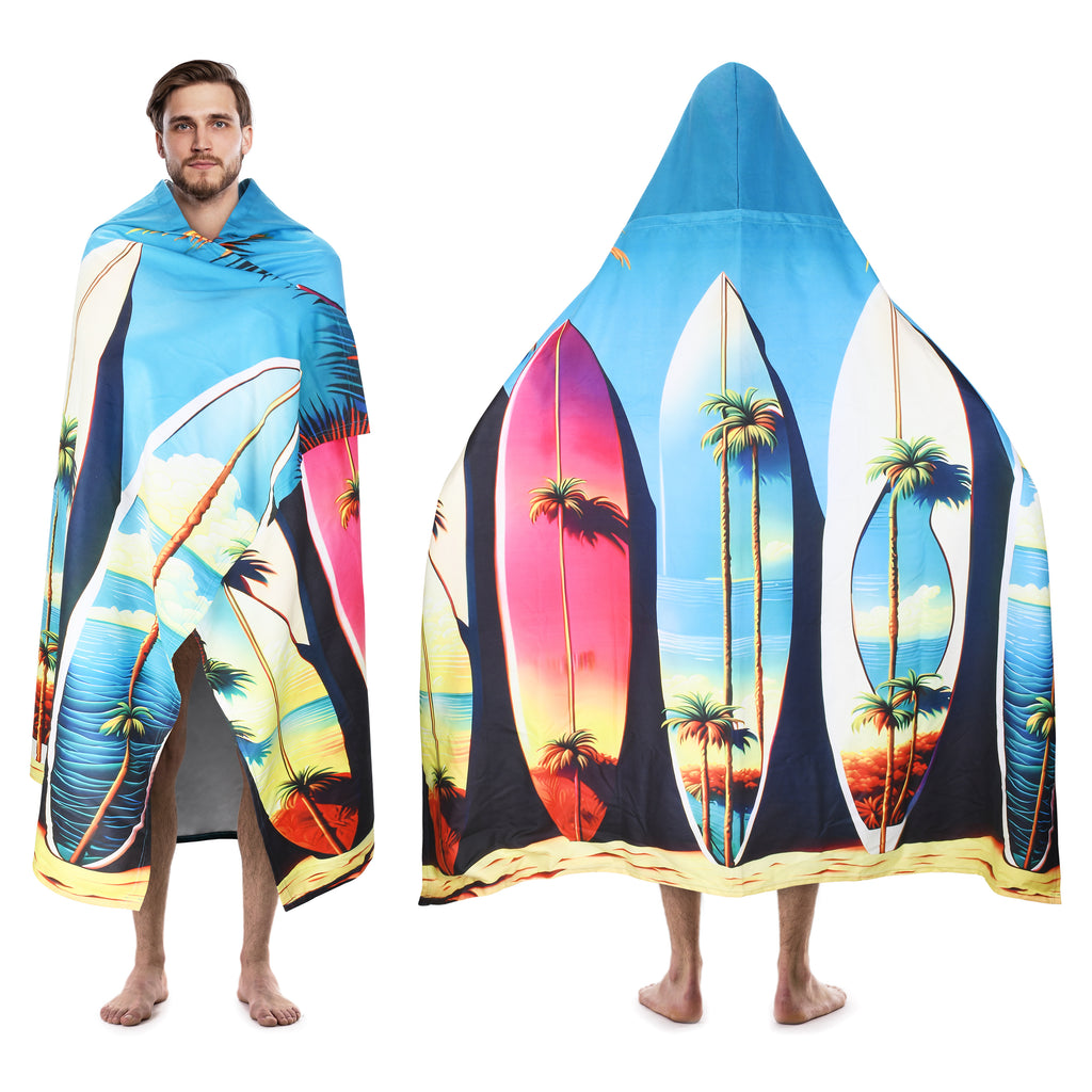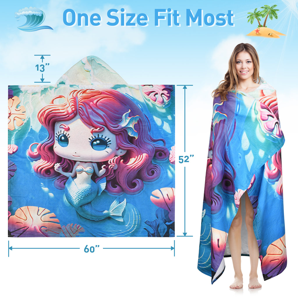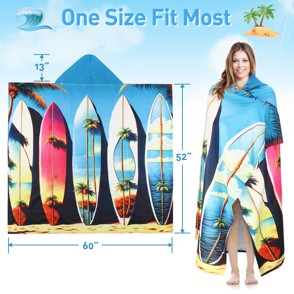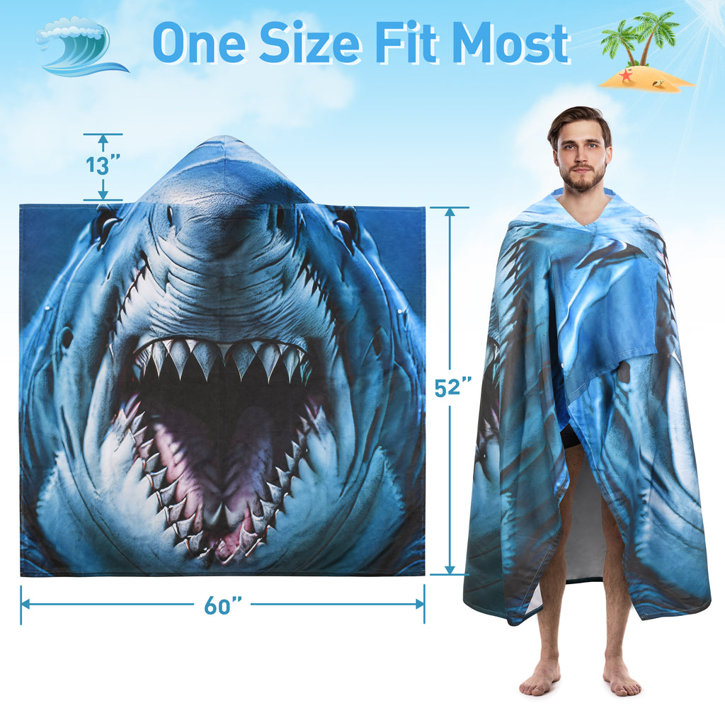 Elevate your coastal look with our fashion-forward Tirrinia Lightweight Beach Poncho Towel With Hood. Perfect for adults, this quick-dry towel is an essential accessory for beach vacations, surfing, poolside lounging, camping trips, and more. Choose from striking patterns like sharks, surfboards, and mermaids to make a statement.