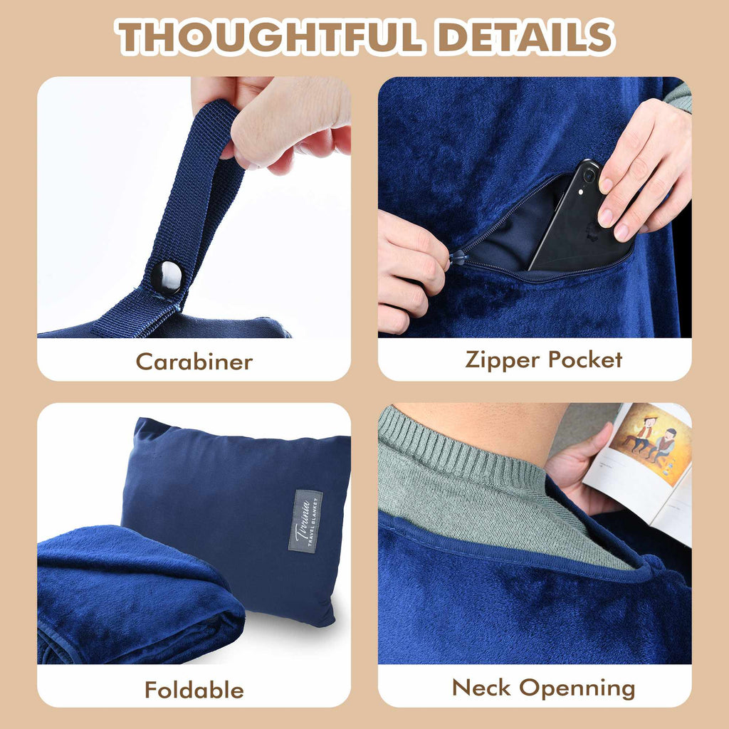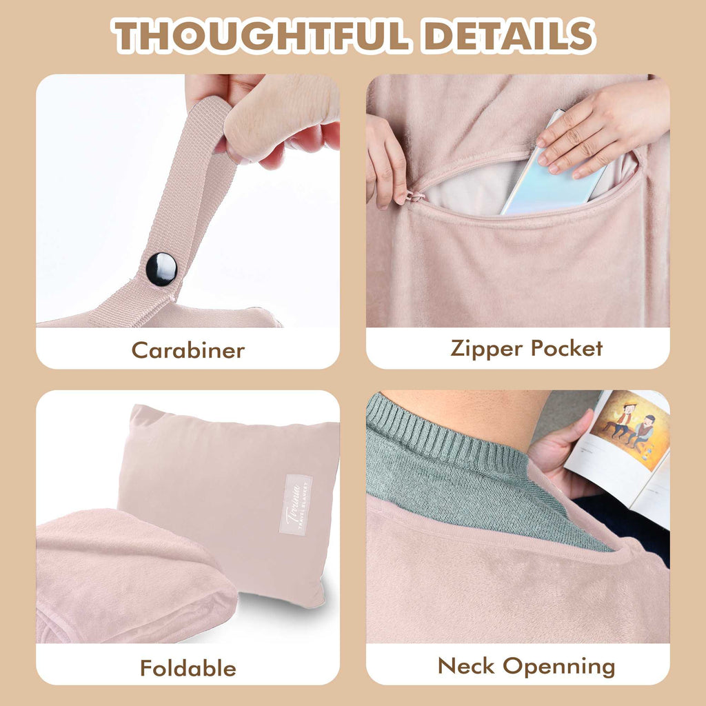 Versatile and Stylish: Whether you're on a plane, train, or enjoying a picnic, this blanket's stylish design and versatile functionality make it an essential travel accessory. This cozy wearable travel blanket could be used as a throw blanket, pillow for head, neck, and lumbar support, while you traveling on planes, in the car, at sporting events, at the cinema, or even office, or lounging at home.
