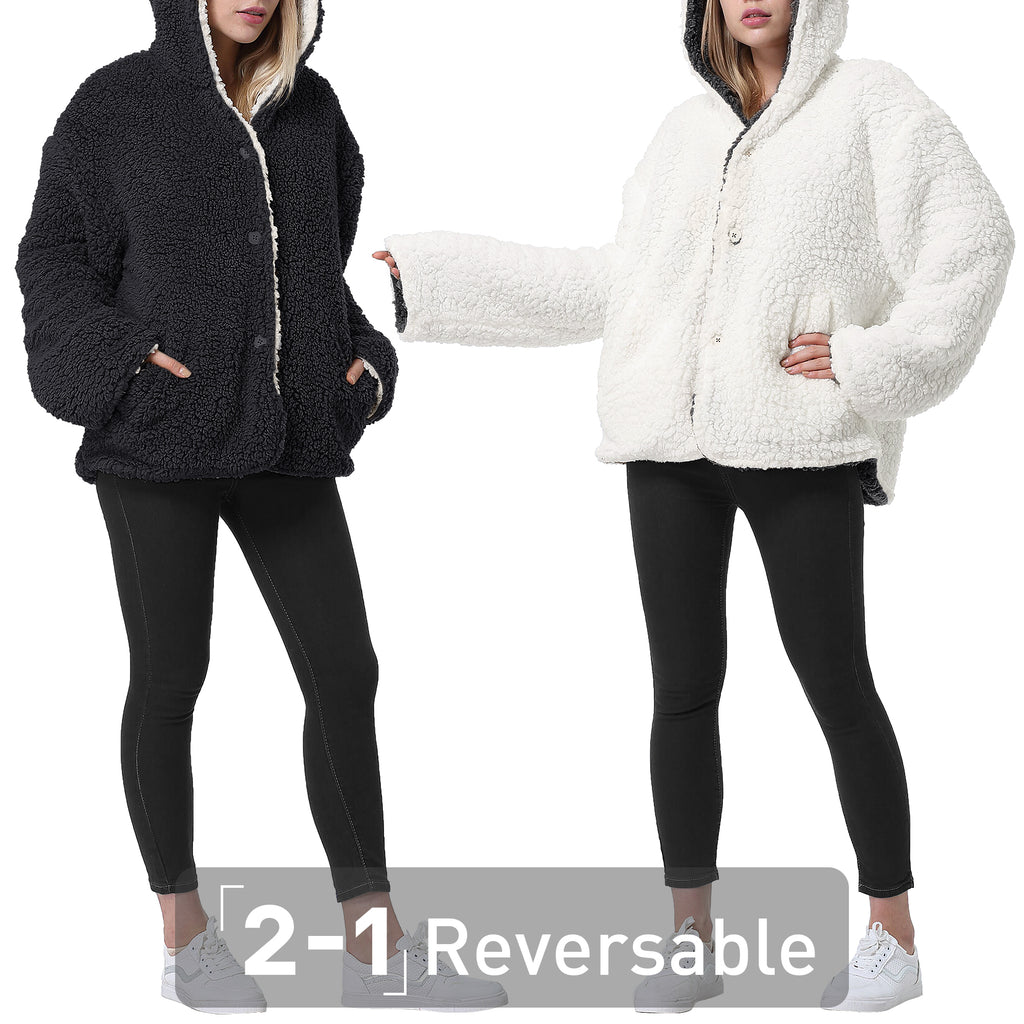 Reversible in a two-tone color palette, long sleeve, open front and button-up, two side pockets, oversized and cozy.