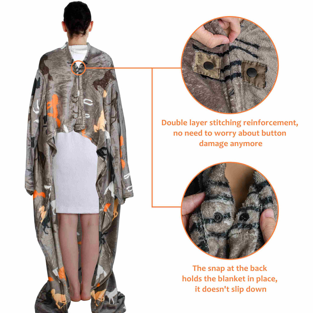 Discover ultimate comfort with our wearable blanket crafted from 100% super micro plush polyester. Designed for luxurious softness, it provides a cozy touch against your skin, ensuring warmth and comfort wherever you go. The innovative snap closure at the back prevents slipping, allowing you to lounge comfortably without readjustment.