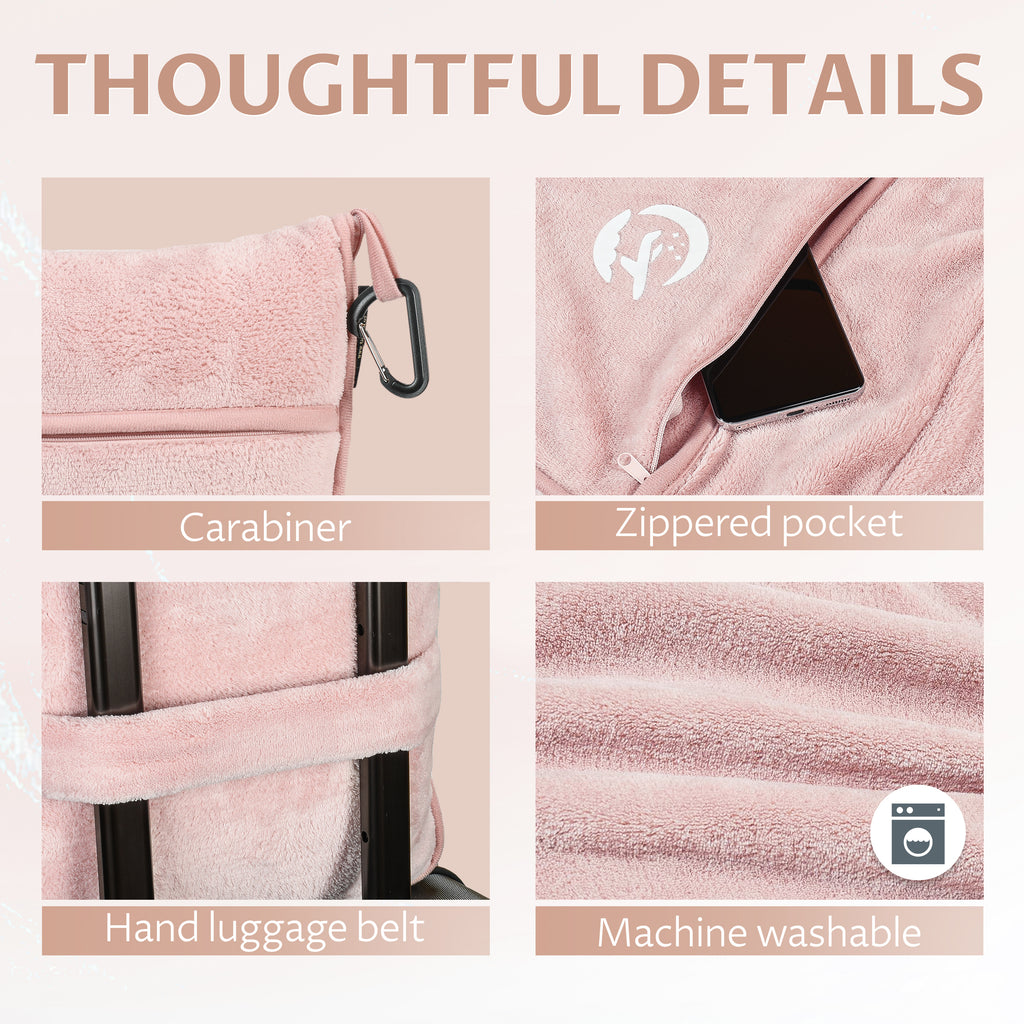 Crafted from durable polyester and lined with ultra-soft micro mink fleece, this airplane blanket pillow feels luxuriously cozy against your skin. It’s lightweight yet warm, giving you just the right level of comfort without overheating.